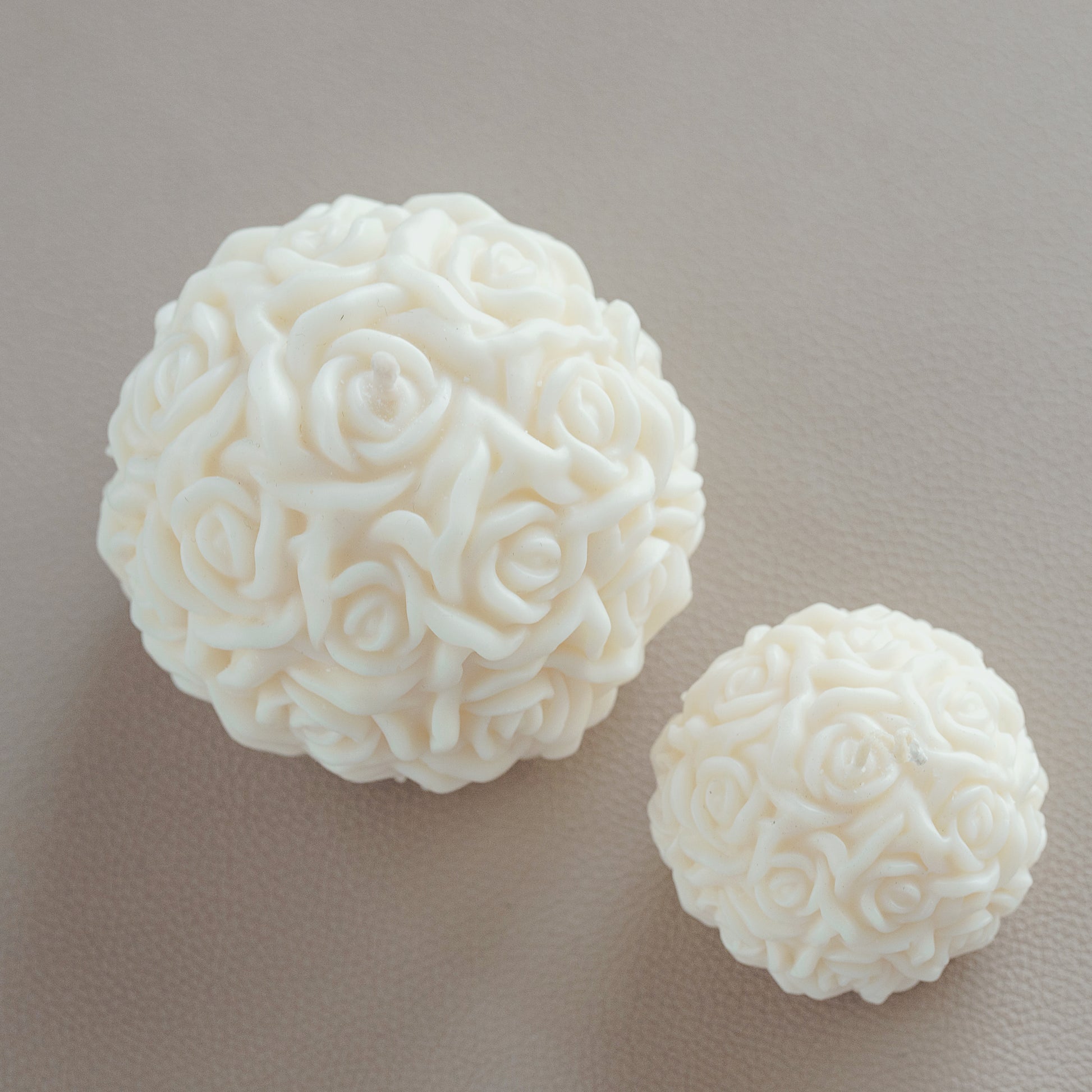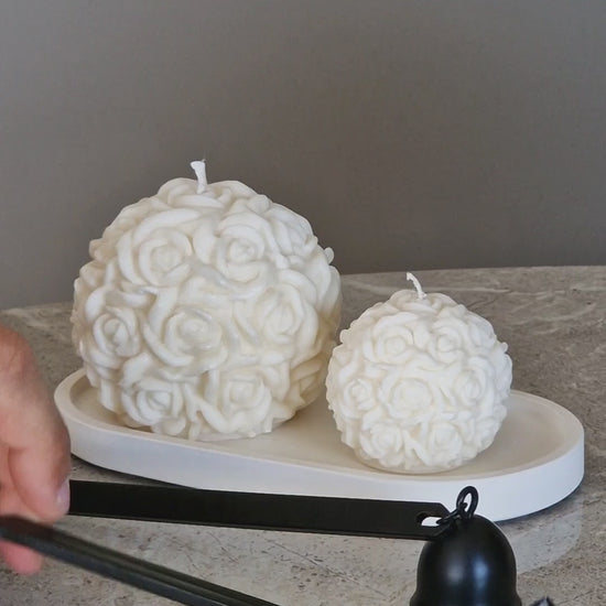 Elegant Rose Ball Candle Duo with Gypsum Tray. This exquisite set features two meticulously handcrafted Rose Ball Pillar Candles in both large and small sizes, accompanied by a stylish oval gypsum tray. Each candle is made from 100% natural rapeseed wax and infused with premium fragrance oils, creating a heavenly scent that fills your home with tranquility and charm.