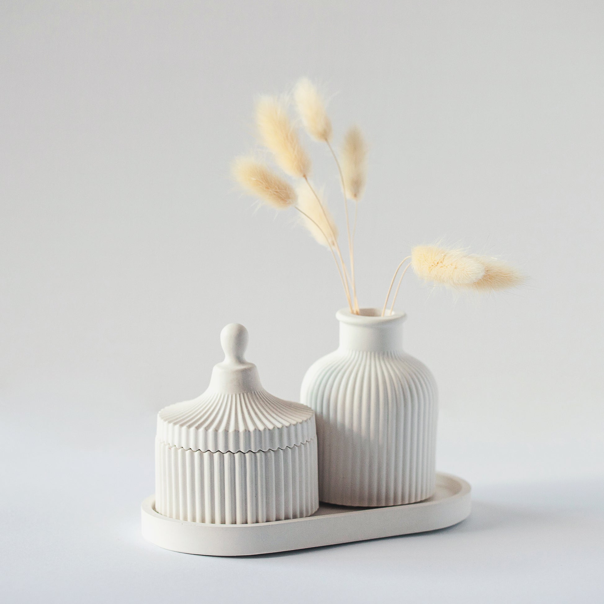 Crafted with precision and care, our scented candle fills your space with a delightful aroma, creating a warm and inviting ambiance. Each candle is thoughtfully infused with premium fragrances, ensuring a long-lasting scent experience that captivates the senses. The accompanying vase adds a hint of style and refinement to your decor, serving as a beautiful centrepiece or accent piece in any room. A white oval tray, designed to complement the candle and vase perfectly.