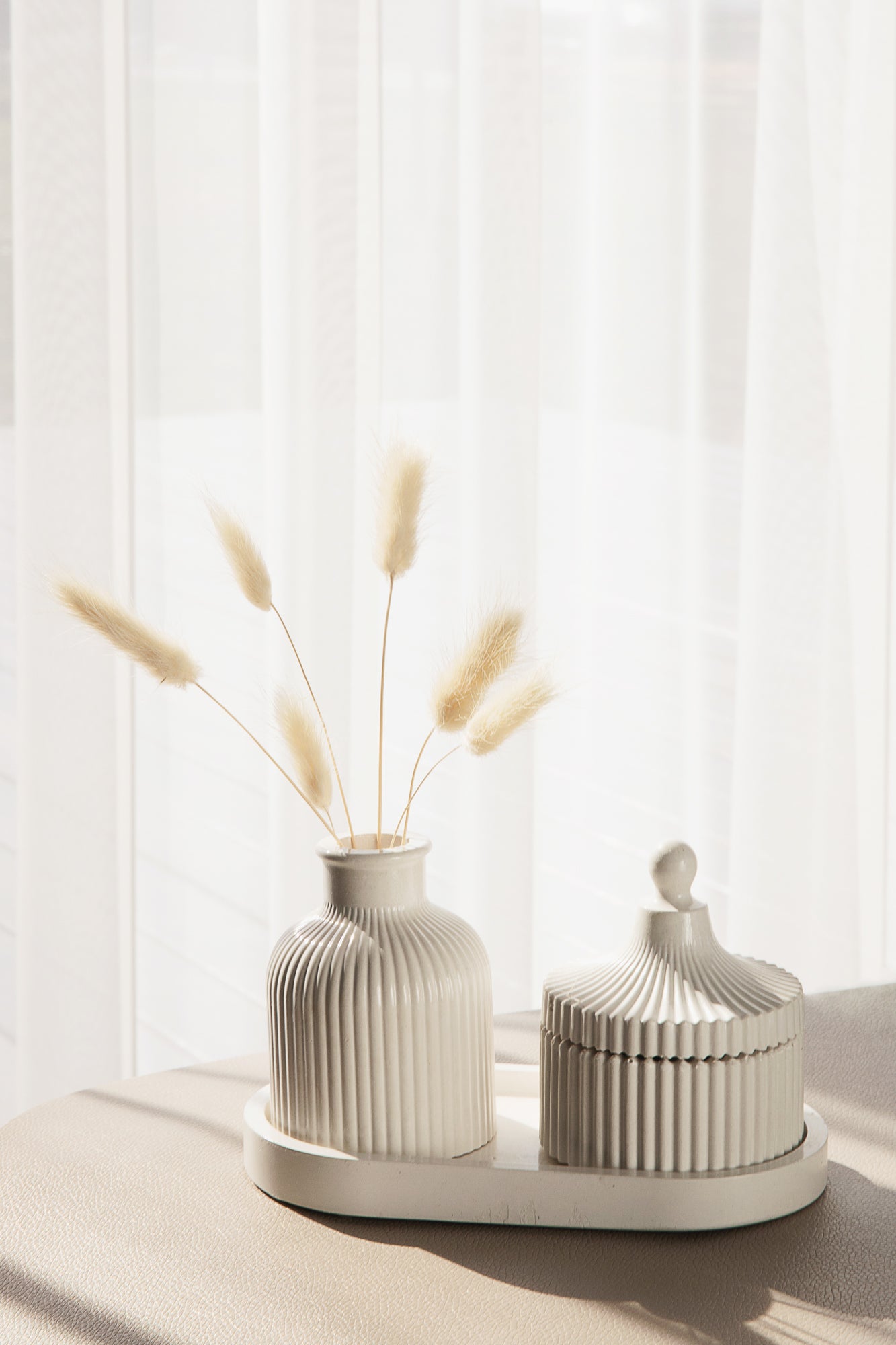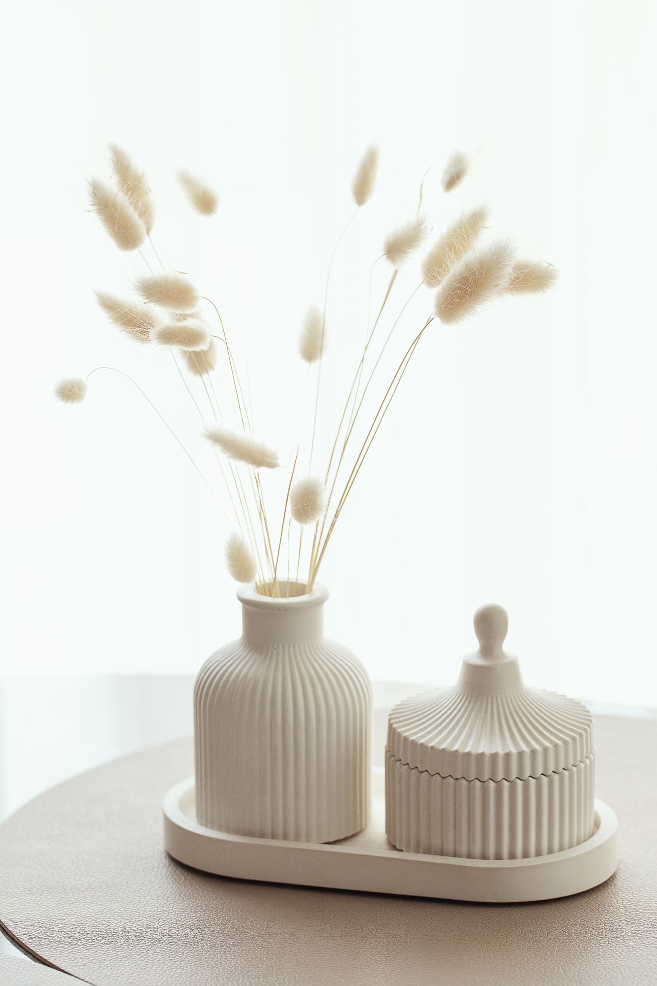 This luxurious set includes a meticulously crafted scented candle, a charming vase, accompanied by an oval tray.