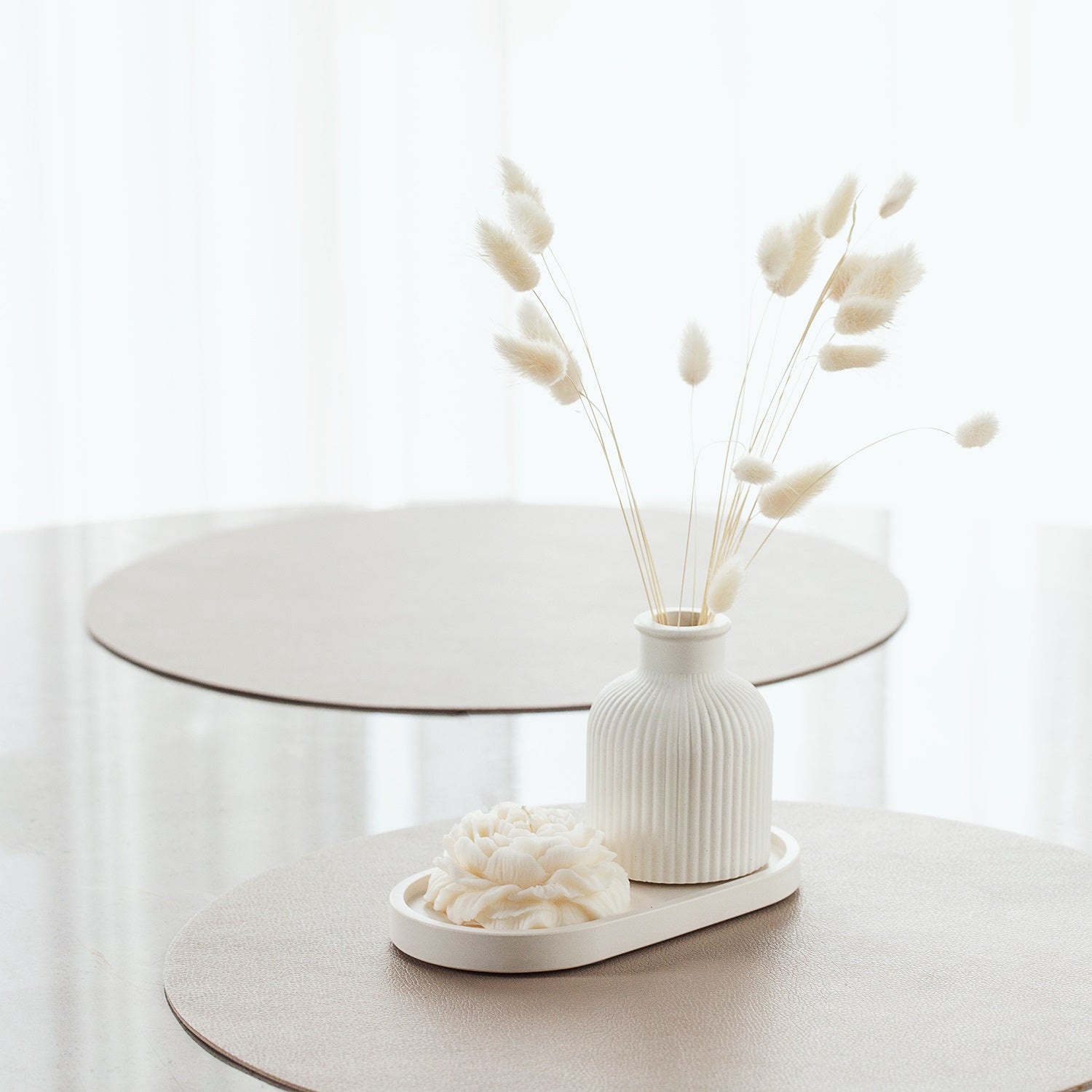 Complementing the candle is an elegantly designed gypsum tray and matching vase, both meticulously crafted to enhance any decor. The gypsum tray provides a stylish base for the candle, while the vase adds a touch of sophistication to your space. Whether used together or separately, these pieces bring a harmonious blend of nature and artistry to your home.