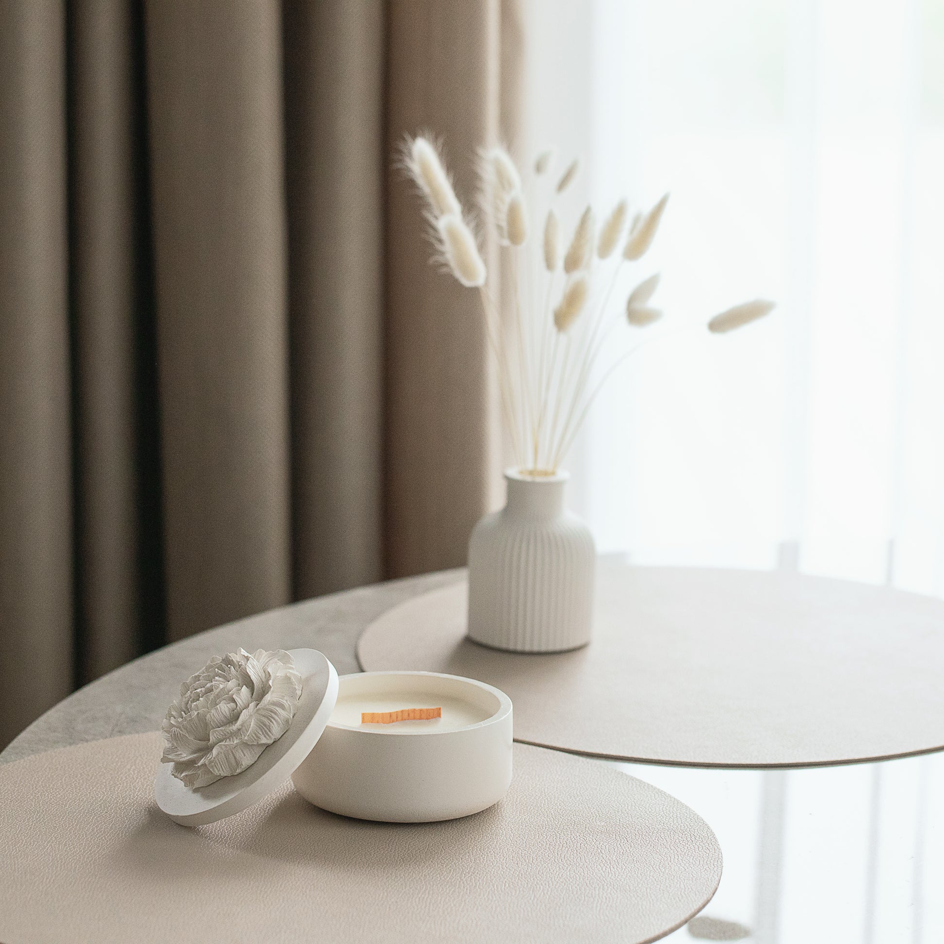 Indulge in the enchanting glow of our Peony-Embraced Scented Coconut Wax Candle. This exquisite creation features a wood wick that crackles gently as it burns, adding to the sensory experience. Encased in a larger gypsum jar adorned with a delicate gypsum peony on the lid, this candle is a harmonious blend of aesthetics and ambience. The coconut wax infuses the air with a captivating fragrance that lingers, transforming any space into a haven of tranquility. Embrace the beauty and serenity of our Peony-Embraced Candle and let it fill your surroundings with both light and fragrance, making every moment special.